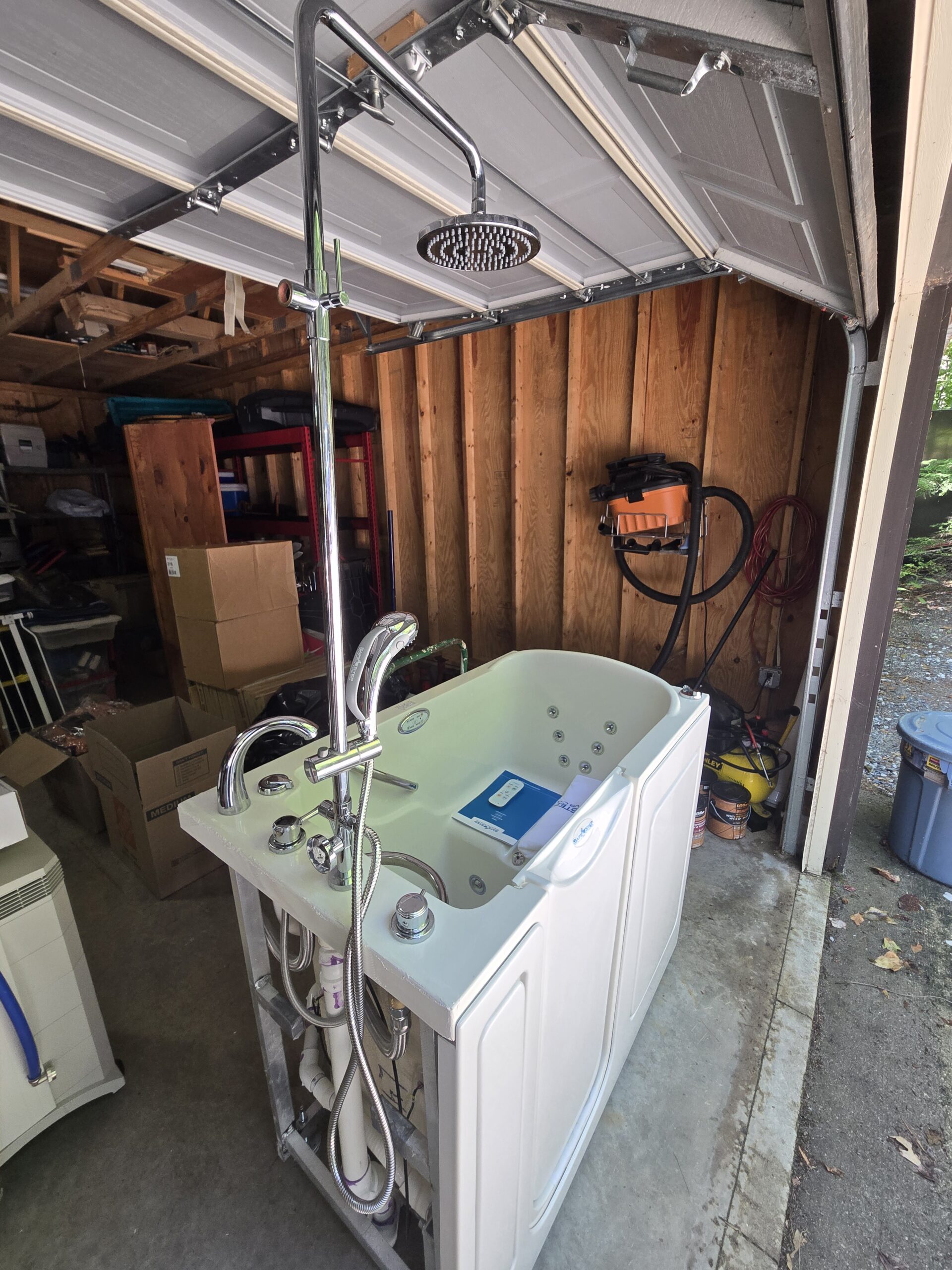 Safe Step walk in tub. Small size, 48″. Perfect size for a smaller space. Not ideal for a larger person, but would be great for a smaller adult or child. Comes with all options that were available, including rain shower, heated seat, lights, water jet…etc. Has all manuals and installation guide.